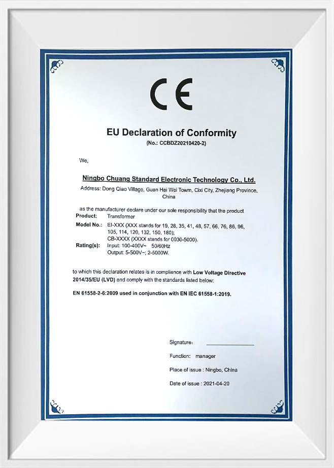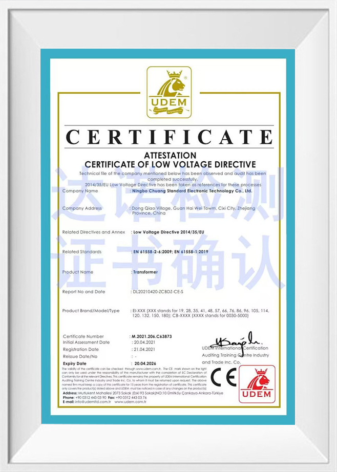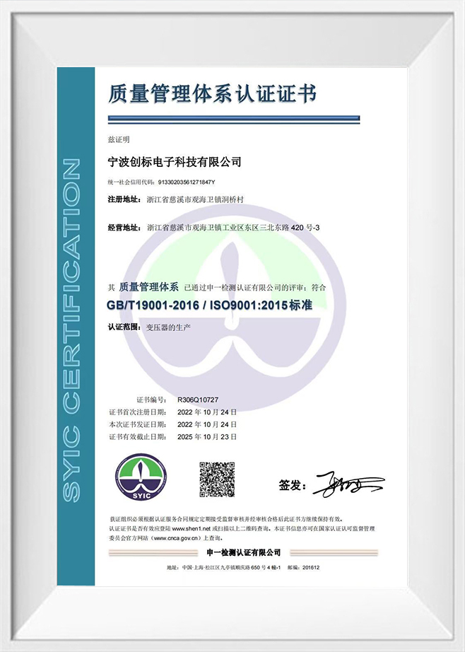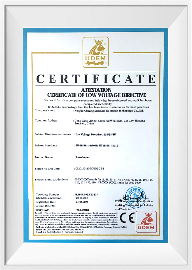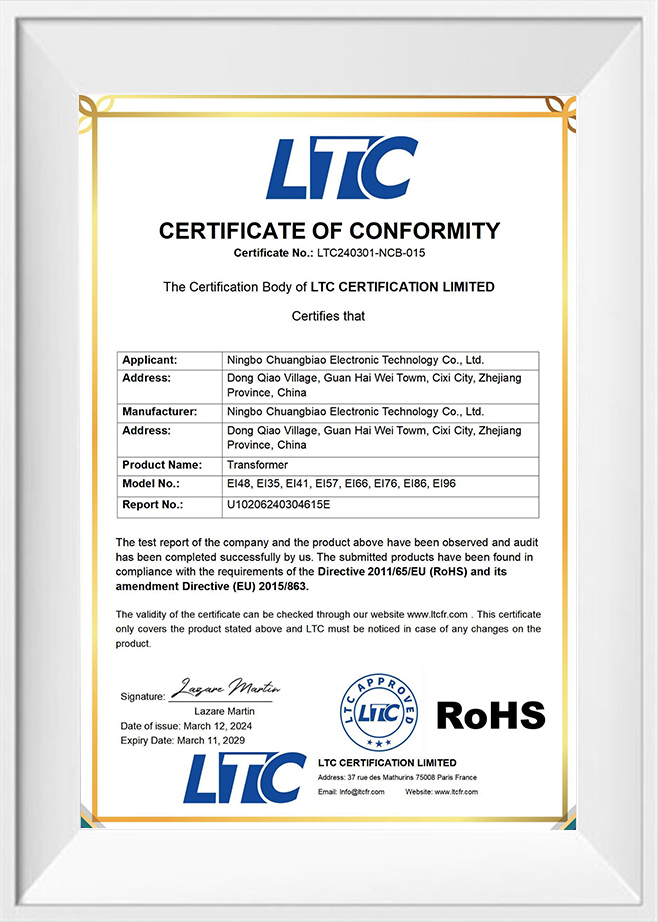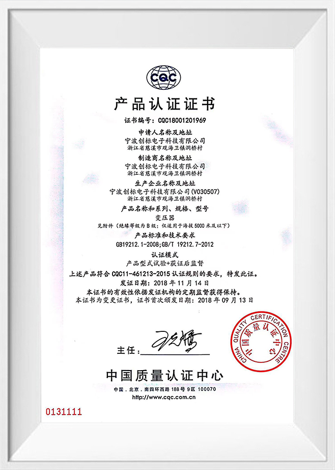 Ang ningbo chuangbiao elektronikong teknolohiya ay may isang malang malakas na pangkat ng pag -unlad ng teknikal, ang lahat sa Impluwensya sa Industriya. Pinipili ng Kumpanya ang Mga materyales maula sa kinikilalang de-Kalidad na mga supplier alinsunod sa mga Pamanantayan ng iso9001. Ang MGA Empleyado ay espiyal na sinanay sa Ginagamit ang Pinaka advanced na Teknolohiya Ngayon, Kabilang ang Mga tool sa makina ng cnc sa Mga awtomatikong sistema ng pagsubok. Ang Bawat Transpormer Na Ginawa Ay Sumasailalim sa Komprehensibong Kalidad Na Inspeksyon sa Pagsubok Bago Umalis sa Pabrika. Ang Kumpanya Ay Naipasa Ang Sertipikasyon Ng Kalidad ng iso9001, Sertipikasyon ng Kalidad ng Produkto Ng Cqc, Sertipikasyon ng Rohs Environmental Protection, ATBP, at Ang Integridad, Lakas sa Kalidad ng Produkto ay kinikilala ng Industriya.